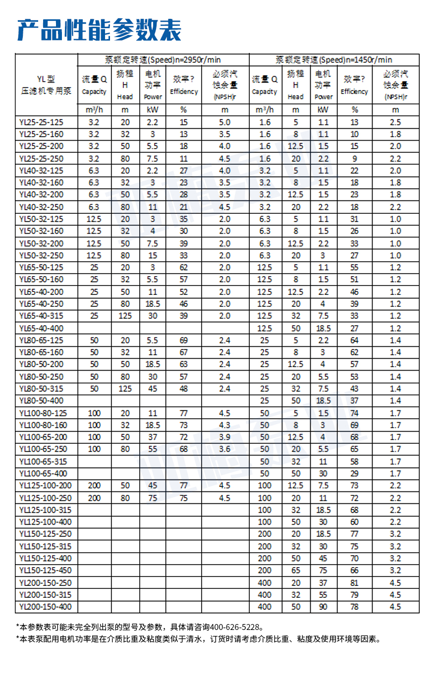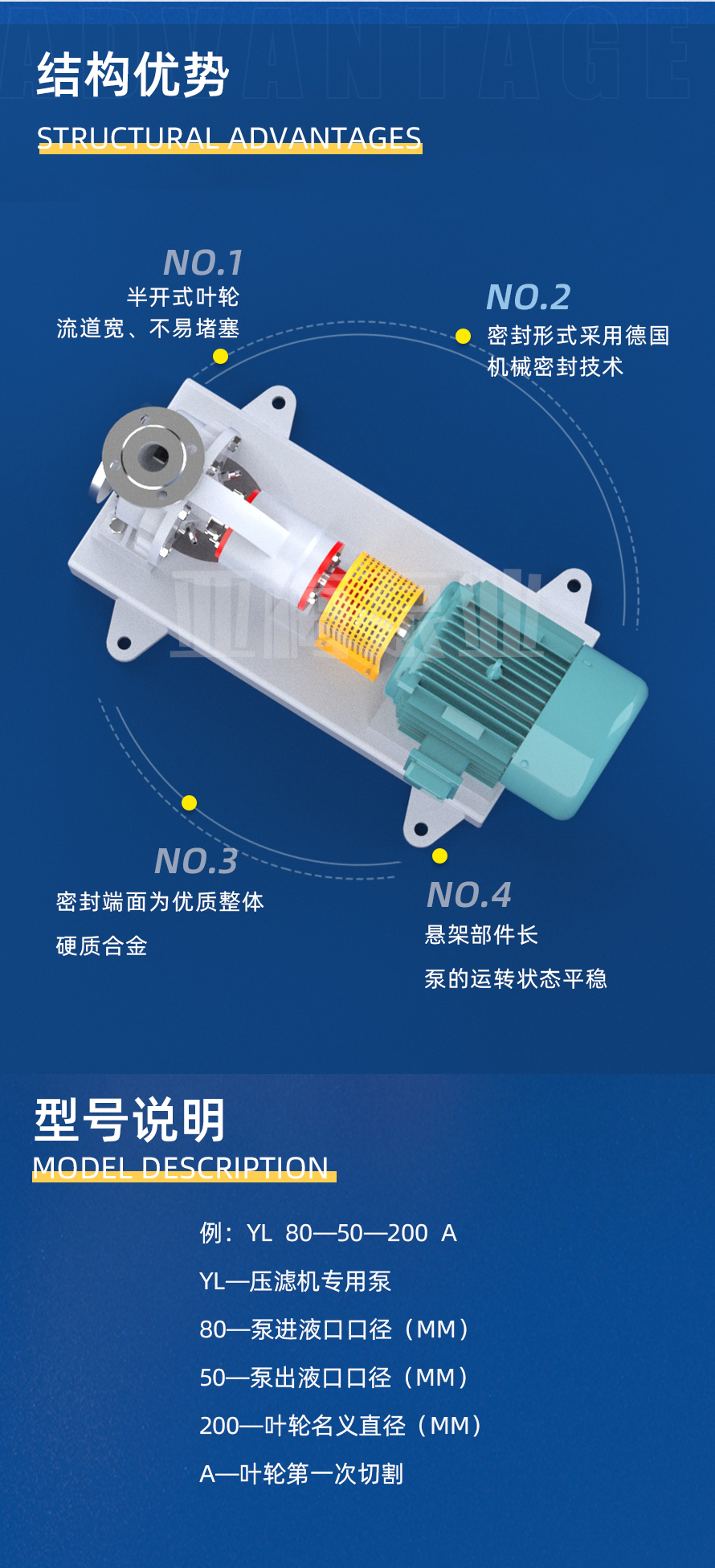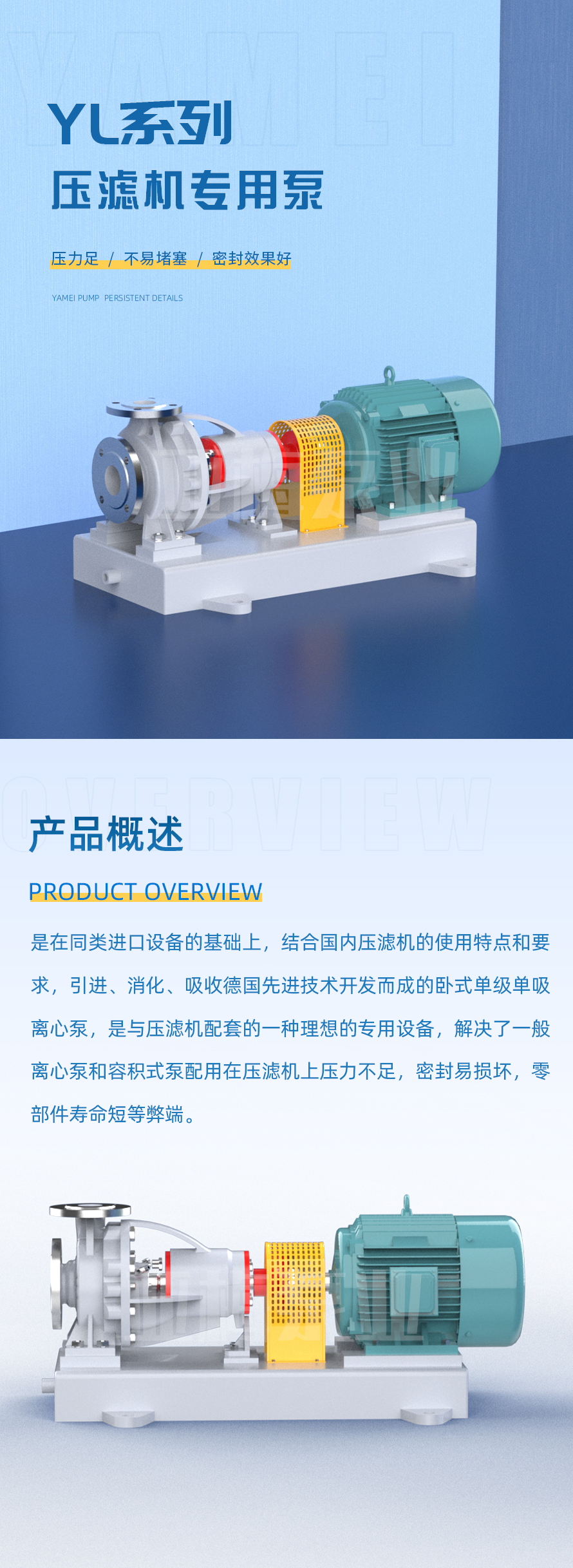YL系列壓濾機專用泵是在同類進口設備的基礎上,結合國內壓濾機的使用特點和要求,引進、消化、吸收德國先進技術開發而成的臥式單級單吸離心泵。是與壓濾機配套的一種理想的專用設備,解決了一般離心泵和容積式泵配用在壓濾機上壓力不足,密封易損壞,零部件壽命短等弊端。