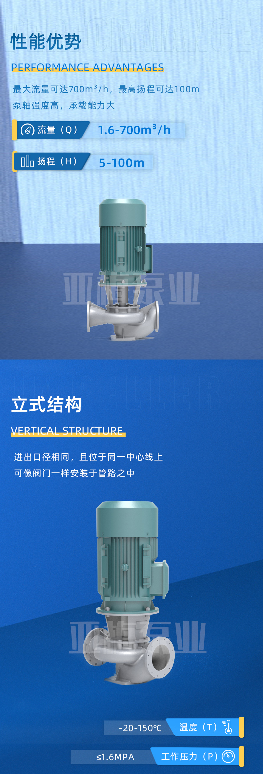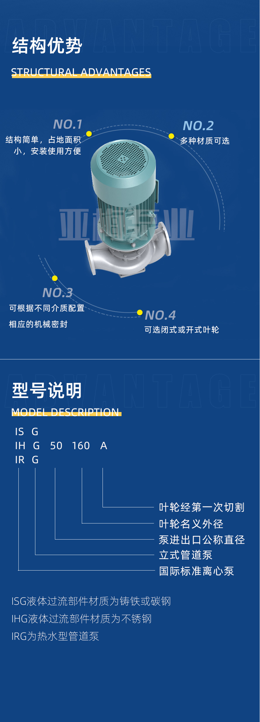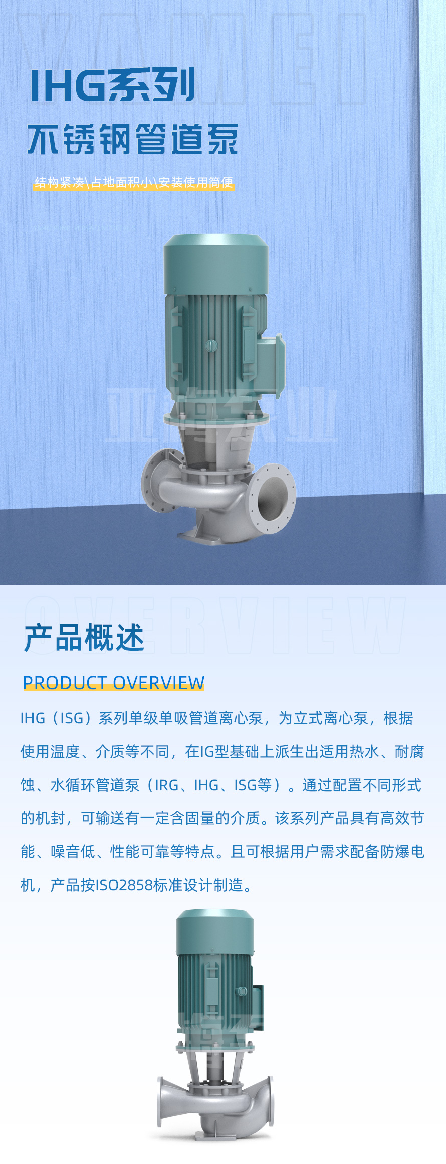 IHG(ISG)系列單級單吸管道離心泵,是本公司科技人員聯(lián)合國內(nèi)水泵專家選用國內(nèi)優(yōu)秀水力模型,采用IS型離心泵之性能參數(shù),在一般立式泵的基礎(chǔ)上進行巧妙組合設(shè)計而成,同時根據(jù)使用溫度、介質(zhì)等不同,在IG型基礎(chǔ)上派生出適用熱水、耐腐蝕、水循環(huán)管道泵(IRG、IHG、ISG等)。該系列產(chǎn)品具有高效節(jié)能、噪音低、性能可靠等特點。且可根據(jù)用戶需求配備防爆電機,產(chǎn)品按ISO2858標(biāo)準(zhǔn)設(shè)計制造。