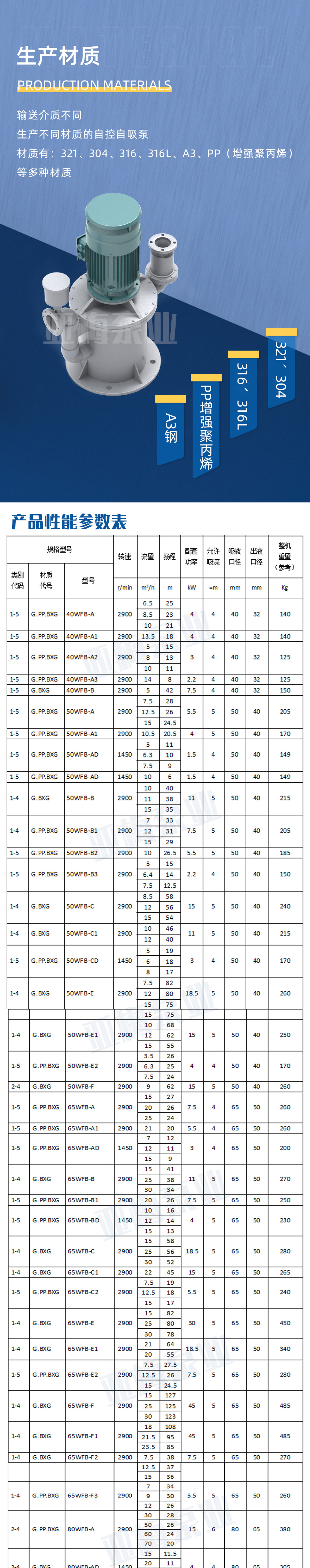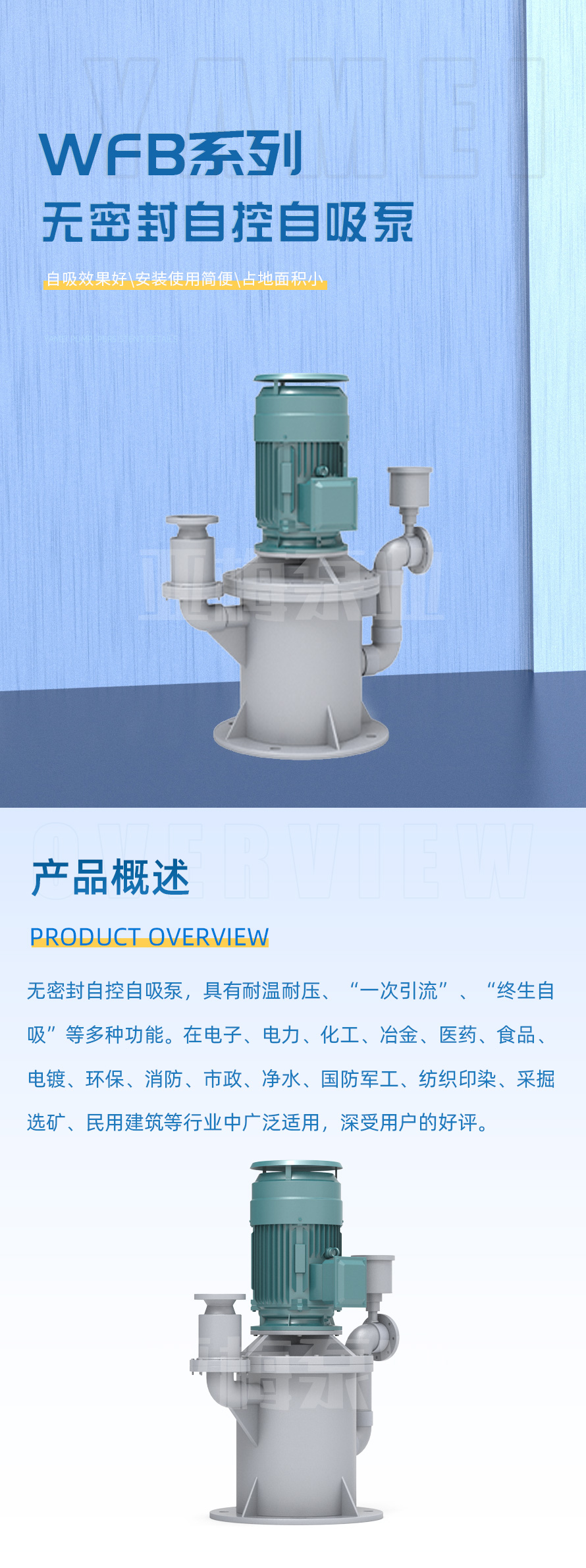 WFB系列無(wú)密封自控自吸泵,具有耐溫耐壓、“一次引流”、“終生自吸”等多種功能。目前生產(chǎn)321、304、316、316L、A3、PP(增強(qiáng)聚丙烯)等多種材質(zhì)的系列整機(jī),五種不同造型共一千余種規(guī)格。在電子、電力、化工、冶金、醫(yī)藥、食品、電鍍、環(huán)保、消防、市政、凈水、國(guó)防軍工、紡織印染、采掘選礦、民用建筑等行業(yè)中廣泛適用,深受用戶的好評(píng)。