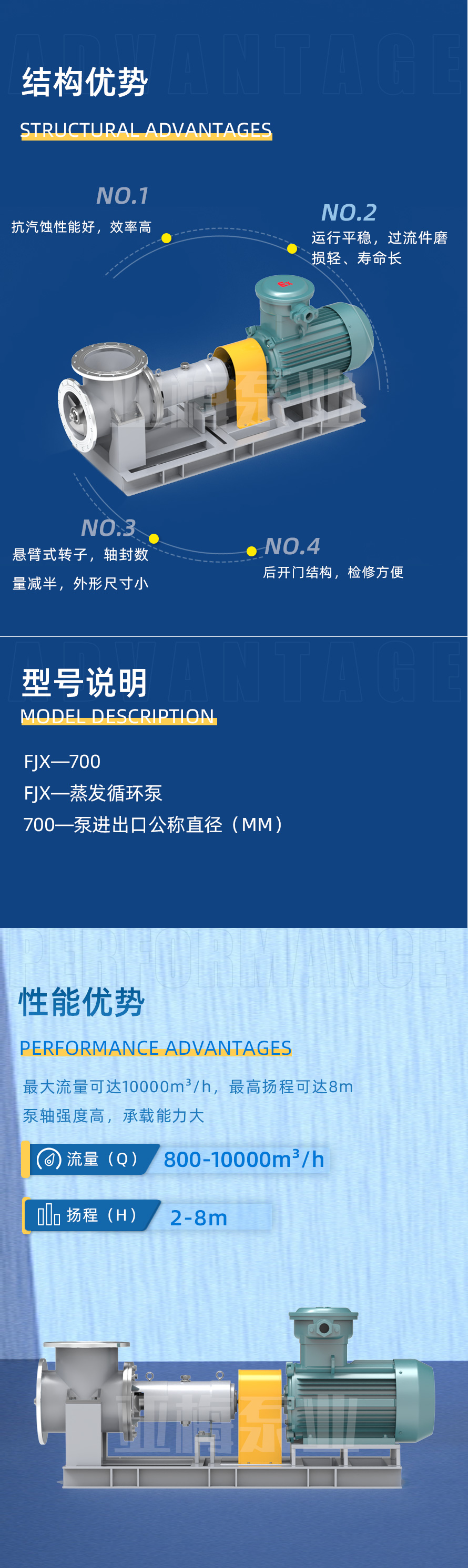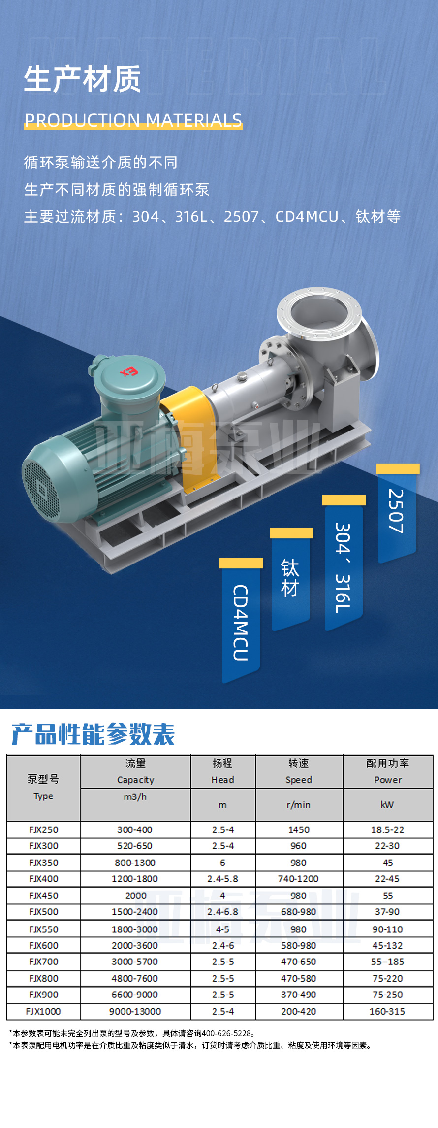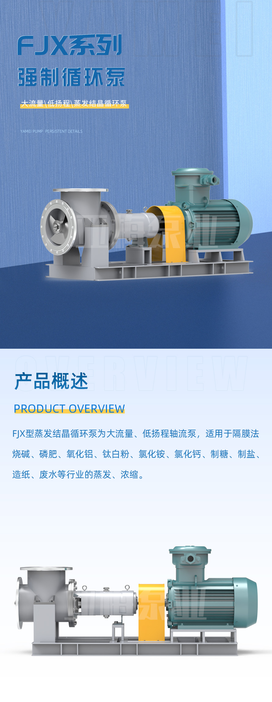 FJX型蒸發結晶循環泵為大流量、低揚程軸流泵,適用于隔膜法燒堿、磷肥、氧化鋁、鈦白粉、氯化銨、氯化鈣、制糖、制鹽、造紙、廢水等行業的蒸發、濃縮。