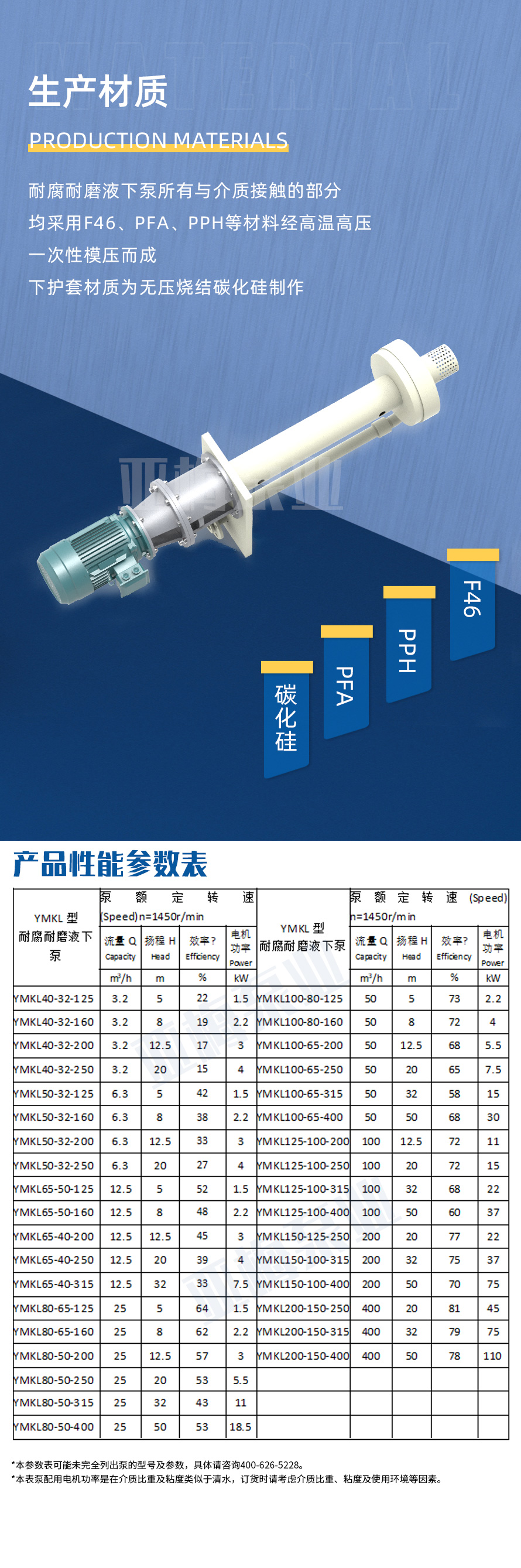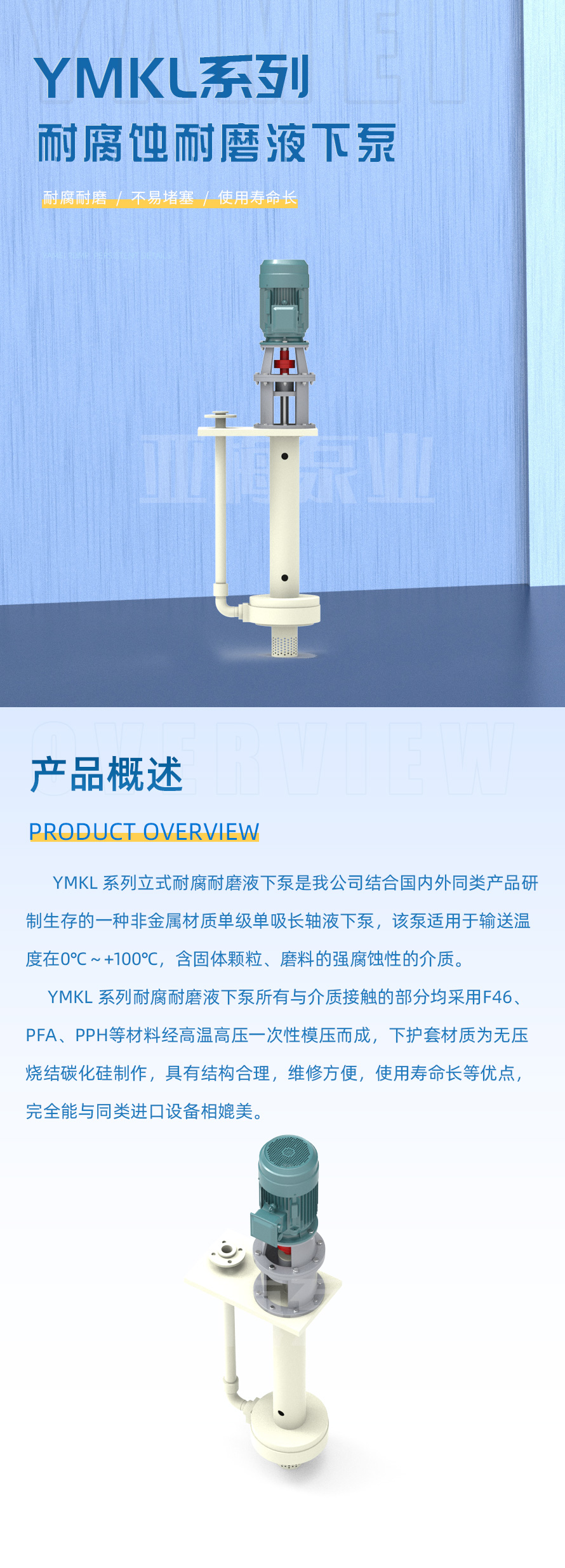 YMKL 系列立式耐腐耐磨液下泵是我公司結合國內外同類產品研制生存的一種非金屬材質單級單吸長軸液下泵,該泵適用于輸送溫度在0℃~+100℃,含固體顆粒、磨料的強腐蝕性的介質。