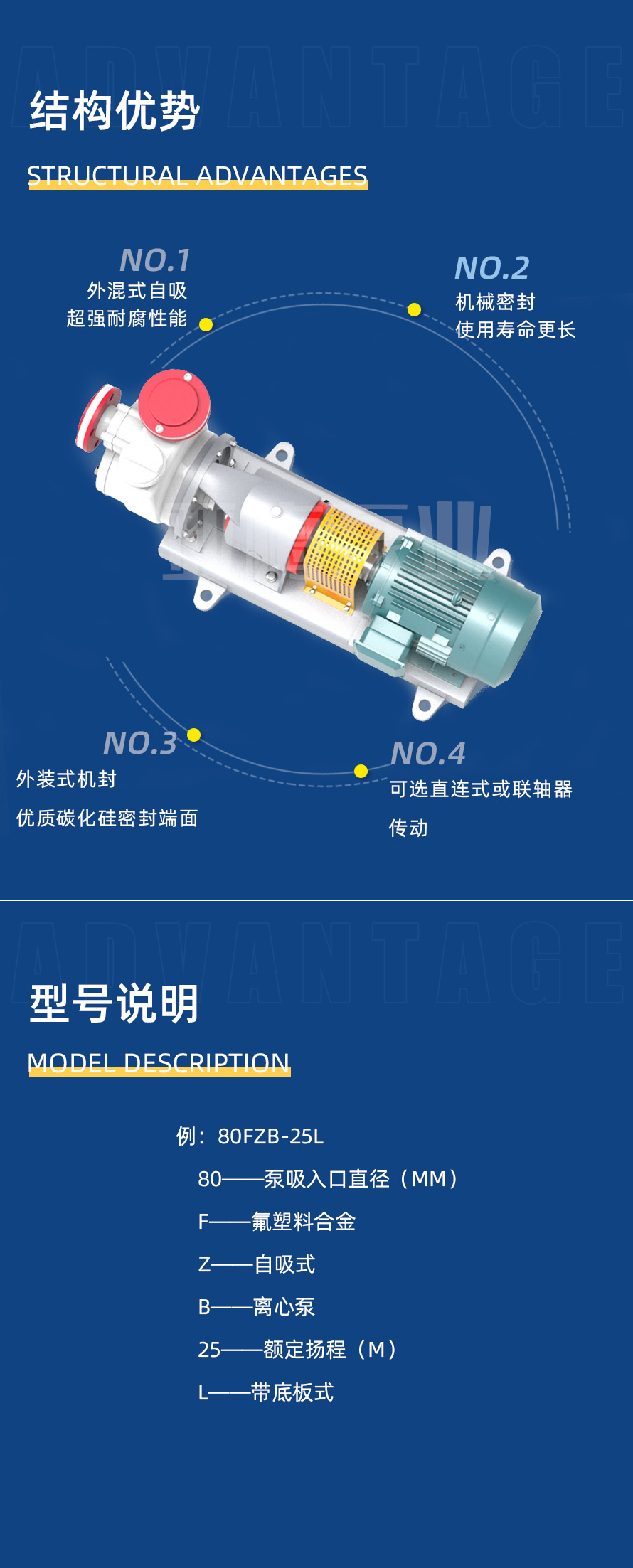 FZB/FZB-L型氟塑料自吸泵,適合于在-5℃到80℃的溫度條件下輸送物理性類似于水的介質(zhì):酸、堿、鹽、氧化劑及其它腐蝕性介質(zhì)(禁止輸送快速硬質(zhì)結(jié)晶體或含有固體顆粒的介質(zhì)),過流部件采用聚全氟乙丙烯樹脂(F46)或聚乙烯樹脂(PE)經(jīng)過模壓、加工而成,它集多種非金屬材料之優(yōu)點,具有超強的耐腐性能,并具有機械強度高,不易老化、無毒素分解等優(yōu)點。是輸送各種強、弱酸、腐蝕性介質(zhì)的理想設備。