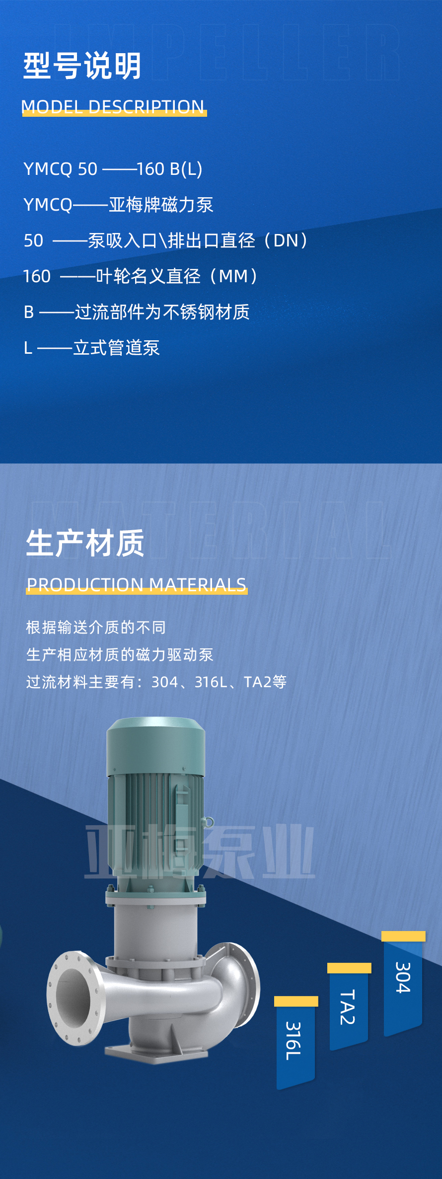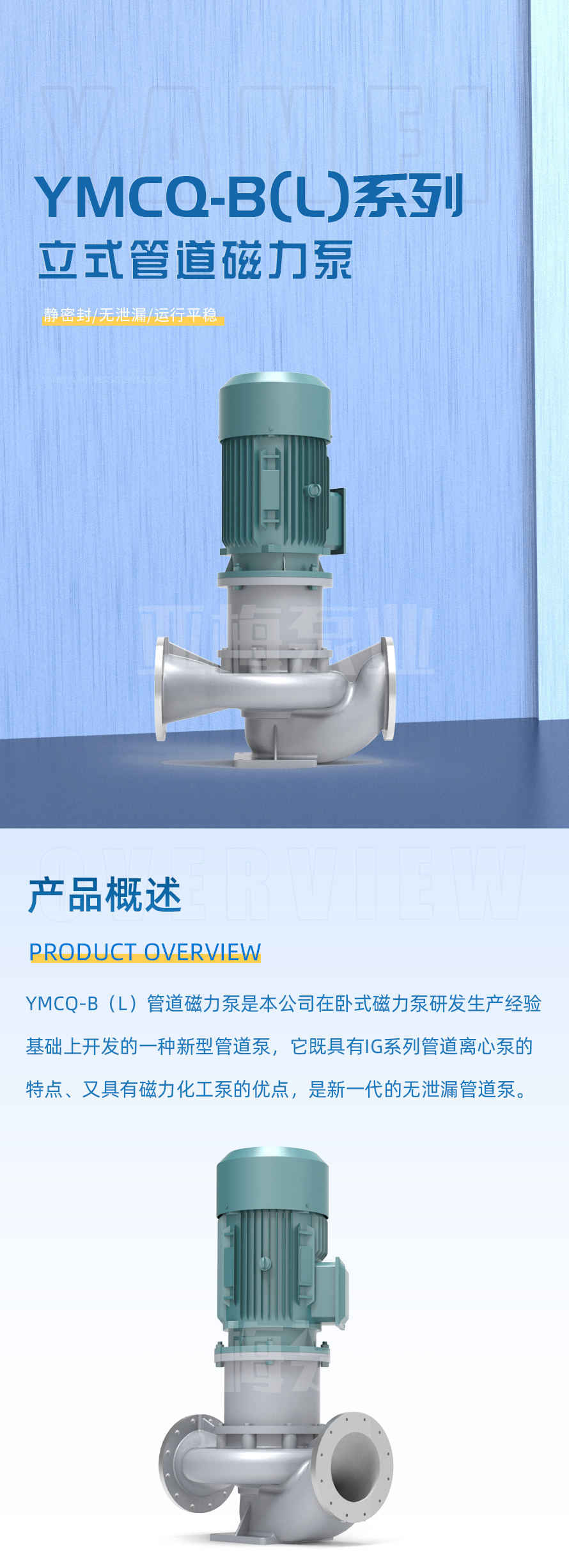 YMCQ-B(L)管道磁力泵是本公司在臥式磁力泵研發生產經驗基礎上開發的一種新型管道泵,它既具有IG系列管道離心泵的特點、又具有磁力化工泵的優點,是新一代的無泄漏管道泵。